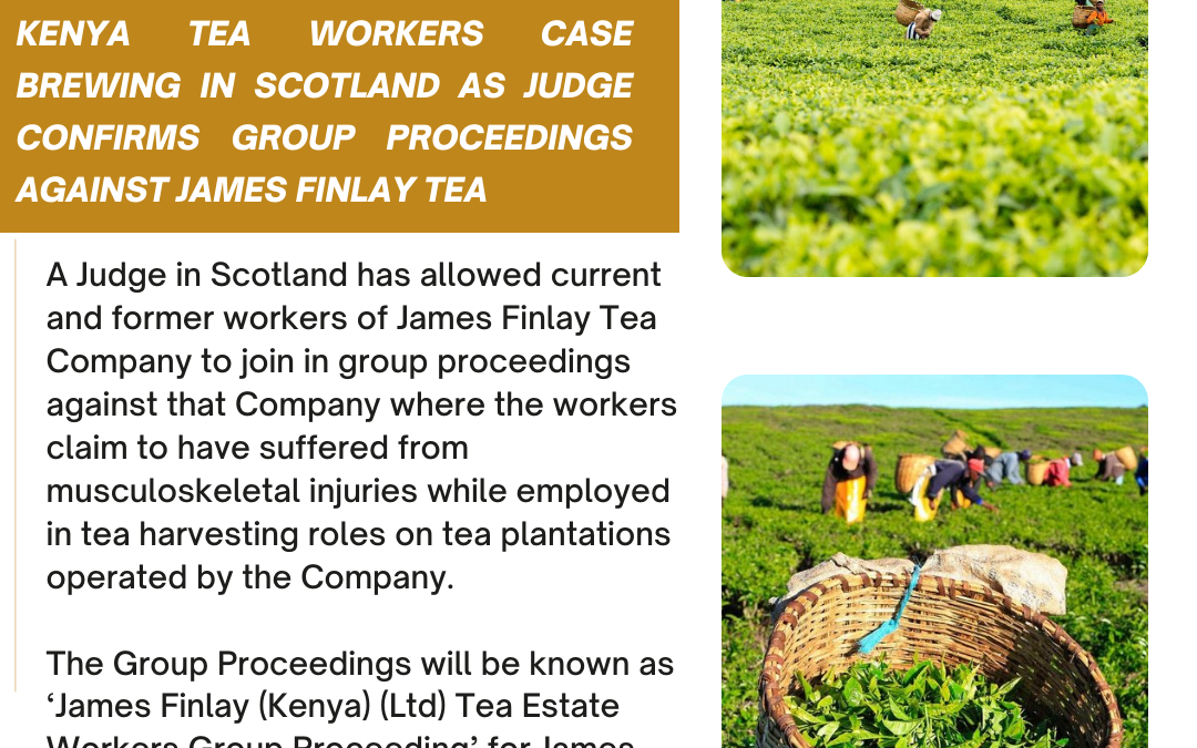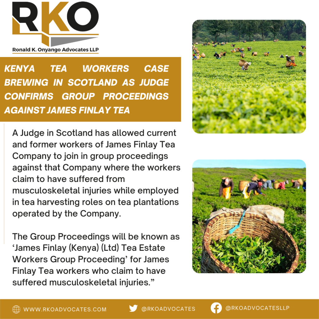 The Group Proceedings will be known as ‘James Finlay (Kenya) (Ltd) Tea Estate Workers Group Proceeding’ for James Finlay Tea workers who claim to have suffered musculoskeletal injuries.”