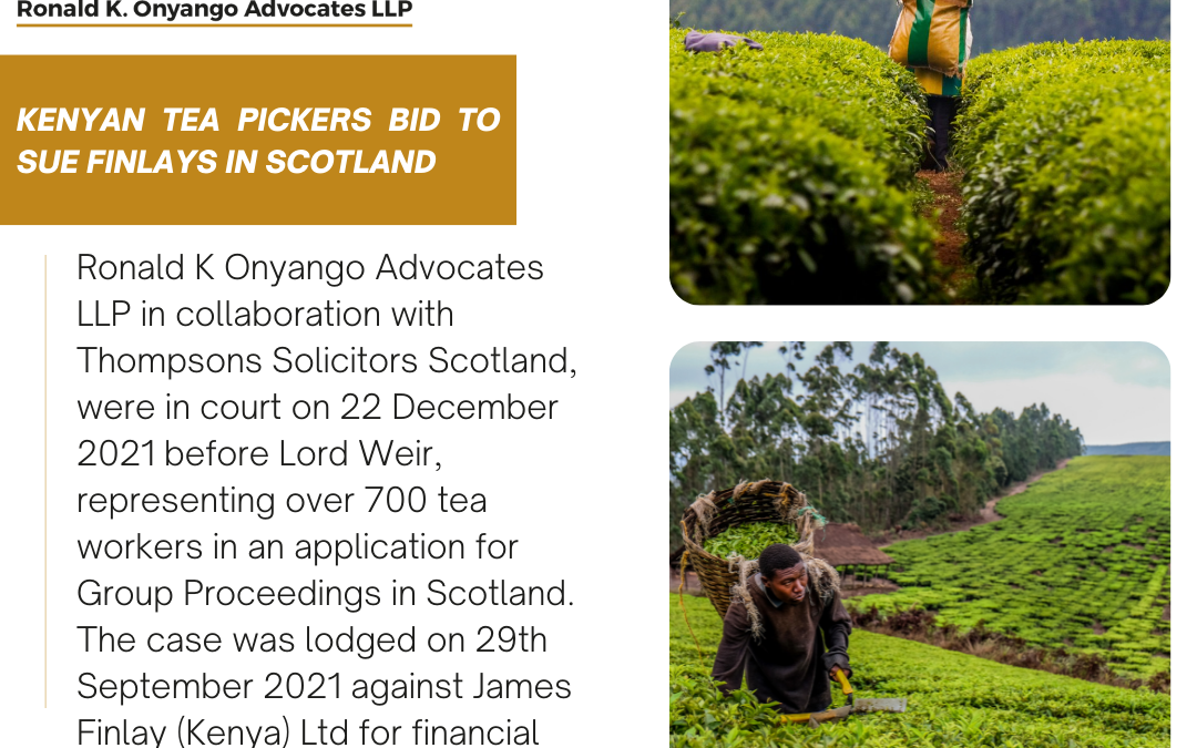 Ronald K Onyango Advocates LLP in collaboration with Thompsons Solicitors Scotland, were in court on 22 December 2021 before Lord Weir, representing over 700 tea workers in an Application for Group Proceedings in Scotland. The case was lodged on 29th September 2021 against James Finlay (Kenya) Ltd for financial compensation and medical rehabilitation of its former and current employees.