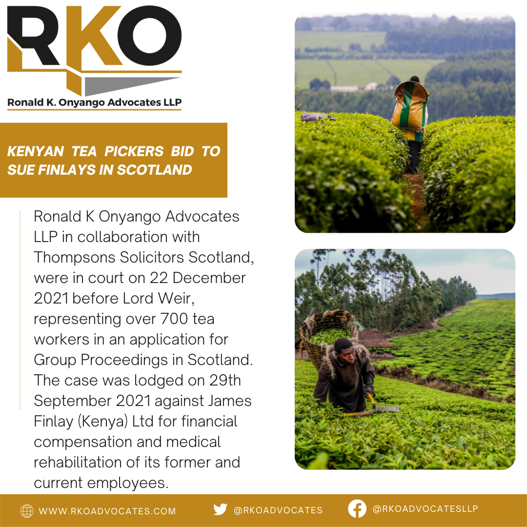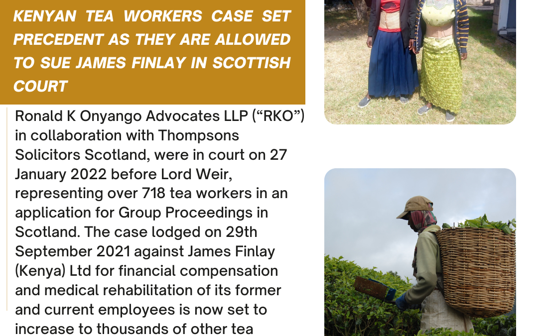 Ronald K Onyango Advocates LLP (“RKO”) in collaboration with Thompsons Solicitors Scotland, was in court on 27 January 2022 before Lord Weir, representing over 718 tea workers in an application for Group Proceedings in Scotland. The case lodged on 29th September 2021 against James Finlay (Kenya) Ltd for financial compensation and medical rehabilitation of its former and current employees is now set to increase to thousands of other tea workers touching on human rights complaints and conditions akin to modern-day slavery. Patrick McGuire, a partner at Thompsons Solicitors which represents the Kenyan workers, said: “This is an extremely important day in the long fight for justice for the Kenyan tea workers”. Ronald Onyango, Managing Partner at RKO Advocates said that ‘there was a need to bring to an end the entrenched oppressive, inhumane and degrading treatment of Kenyan tea workers by multinationals operating in Kenya.”